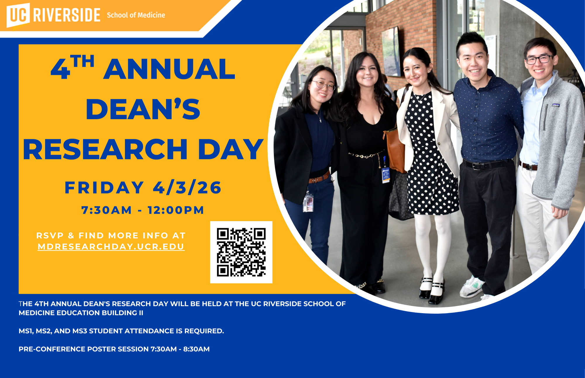 The fourth annual Dean’s Research Day at the UC Riverside School of Medicine will be held on Friday, April 3, 2026 from 7:30 am-12:00 pm in the UCR SOM Education II building.
